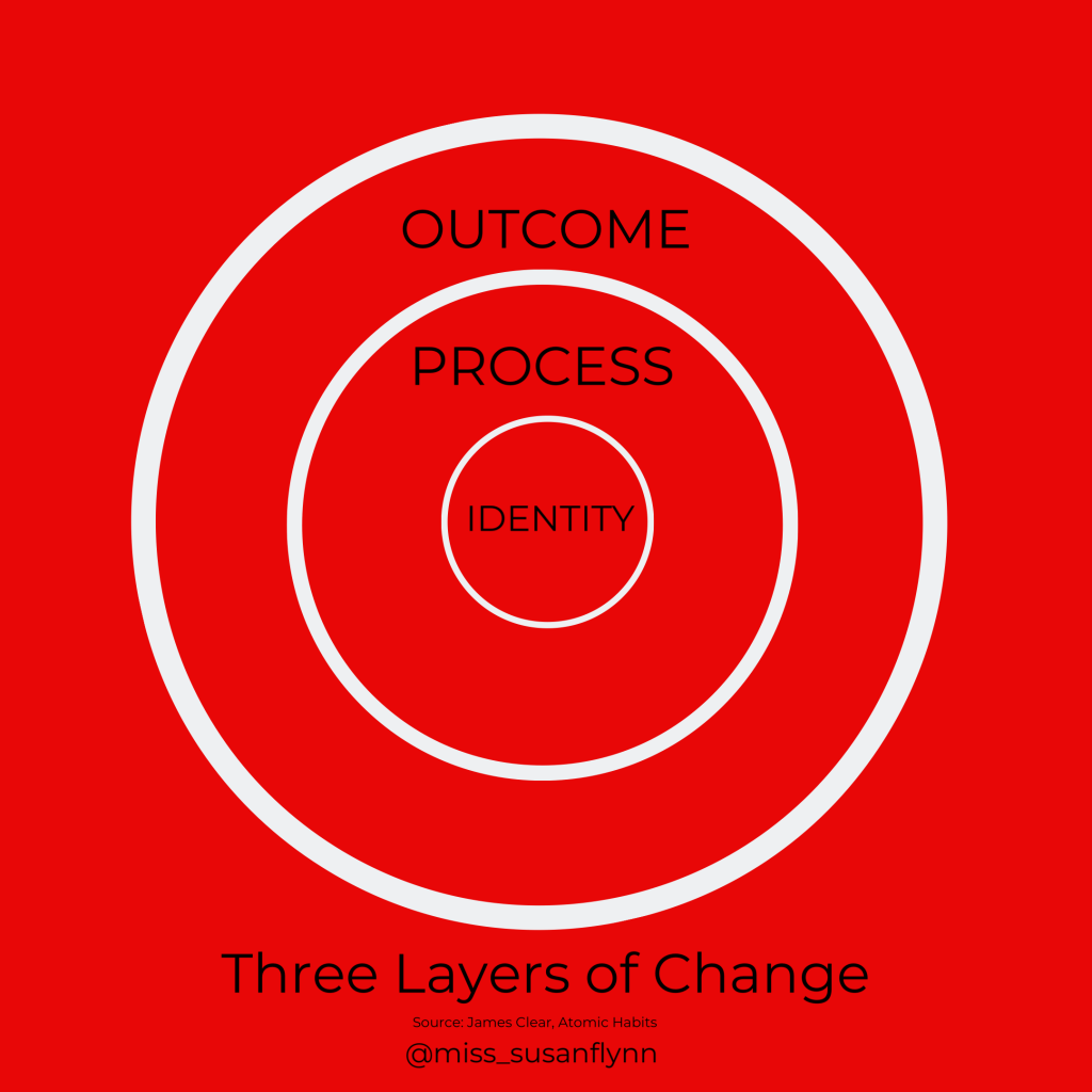 When we want to create a habit, or change a behaviour we generally focus on the outcome such as: I will go to the gym three times a week to loose weight (the outcome). If you want change that lasts, you need to focus on the person you want to become. If you want to get fit, adopt the belief that health is your number one value or that you are an athlete. Everlasting change happens when the habit becomes part of your identity.